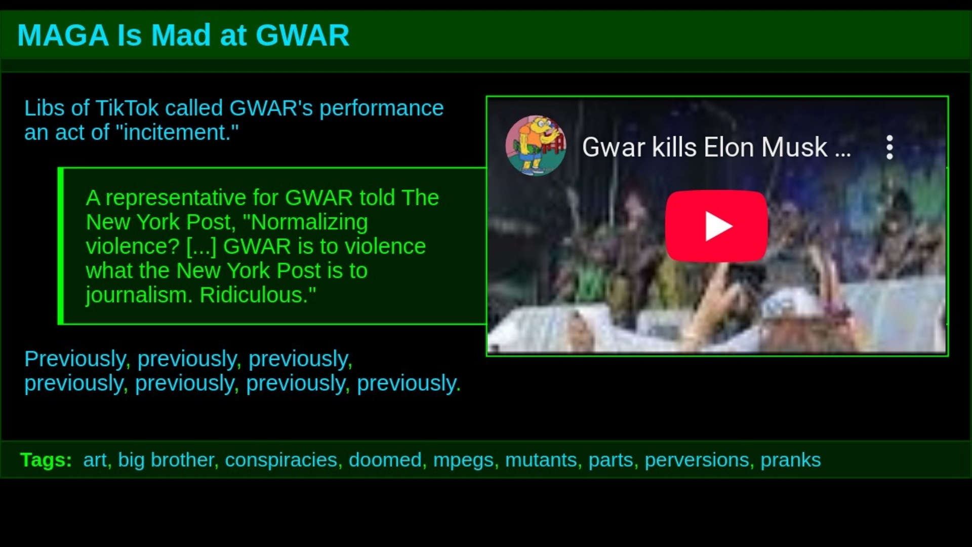 Libs of TikTok called GWAR's performance an act of "incitement." A representative for GWAR told The New York Post, "Normalizing violence? [...] GWAR is to violence what the New York Post is to journalism. Ridiculous."