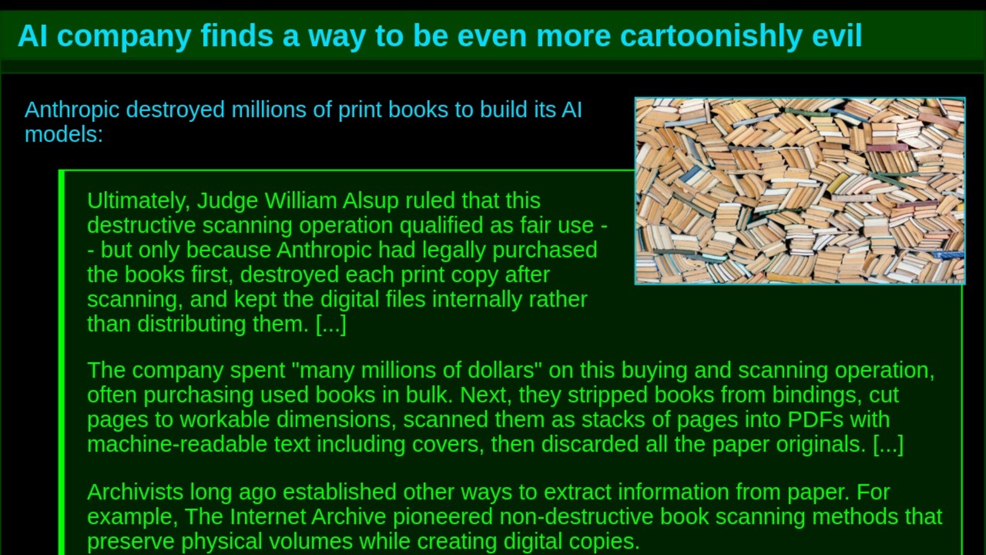 Anthropic destroyed millions of print books to build its AI models: Ultimately, Judge William Alsup ruled that this destructive scanning operation qualified as fair use -- but only because but only because Anthropic had legally purchased the books first, destroyed each print copy after scanning...