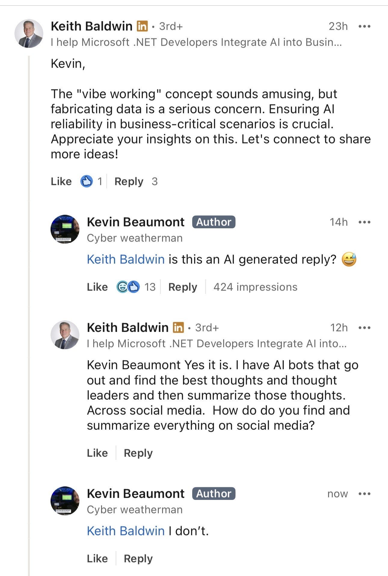 LinkedIn is already a glorious trash fire but now I have people doing AI replies to my posts. 🫡
