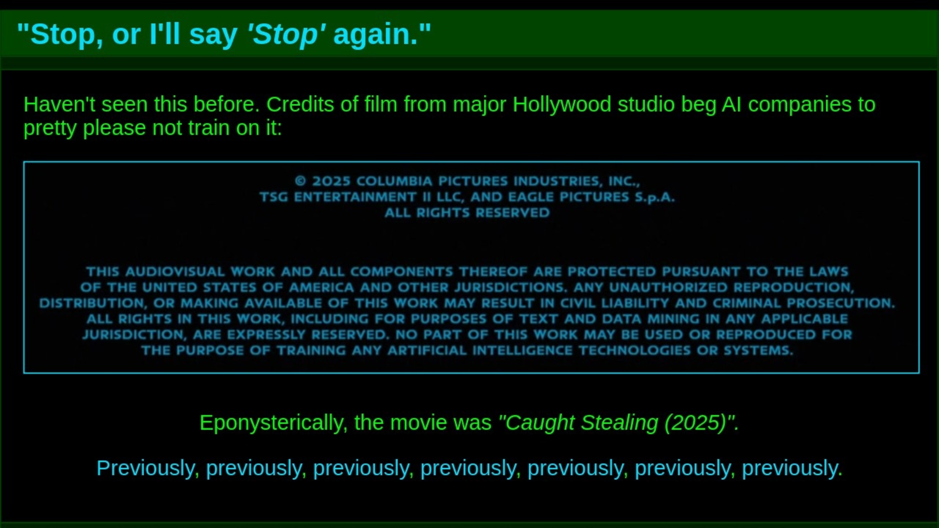 Haven't seen this before. Credits of film from major Hollywood studio beg AI companies to pretty please not train on it: Eponysterically, the movie was "Caught Stealing (2025)".