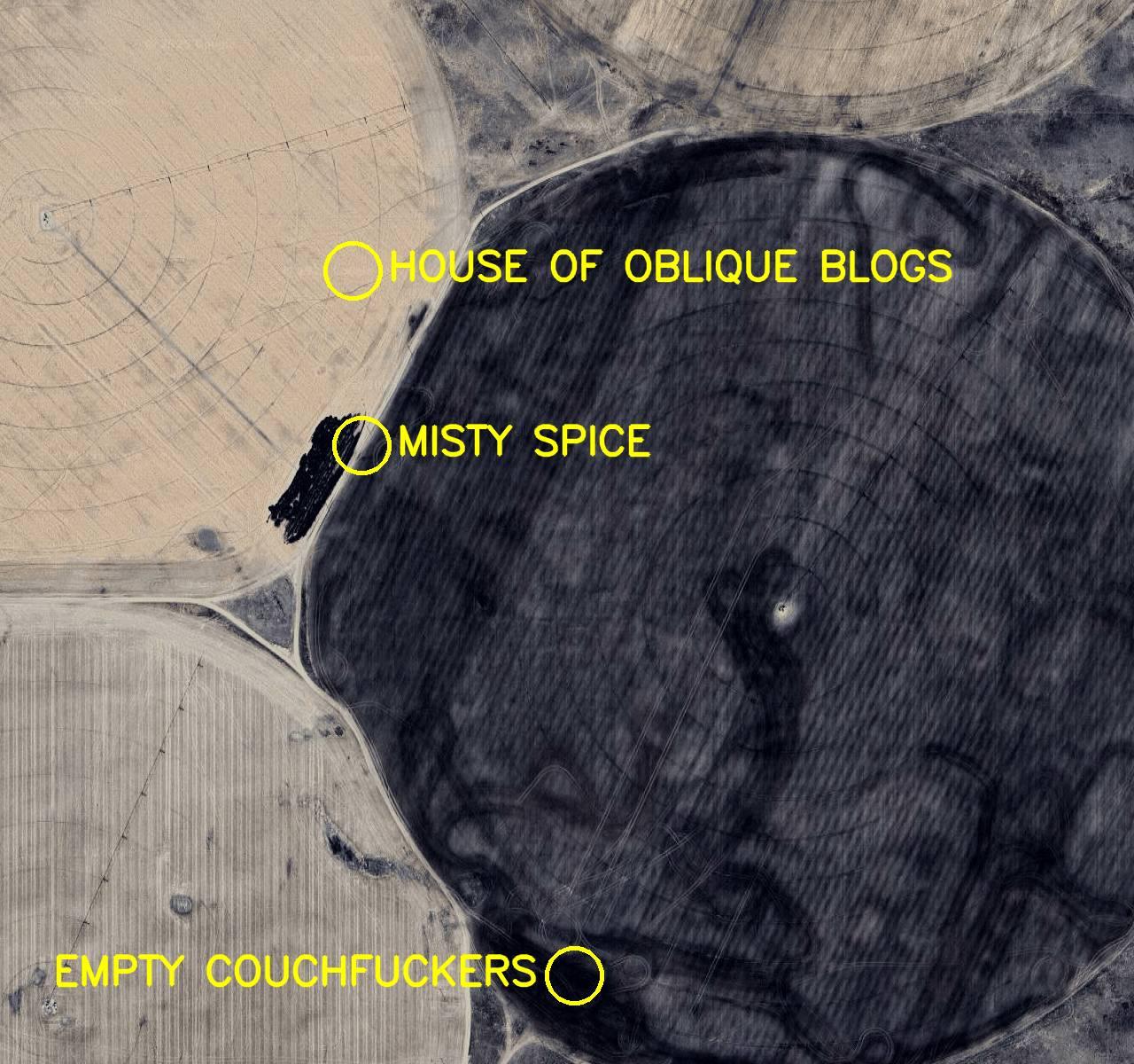 Aerial satellite photo labelled in bright yellow letters:  1. House of Oblique Blogs 2. Empty Couchfuckers 3. Misty Spice