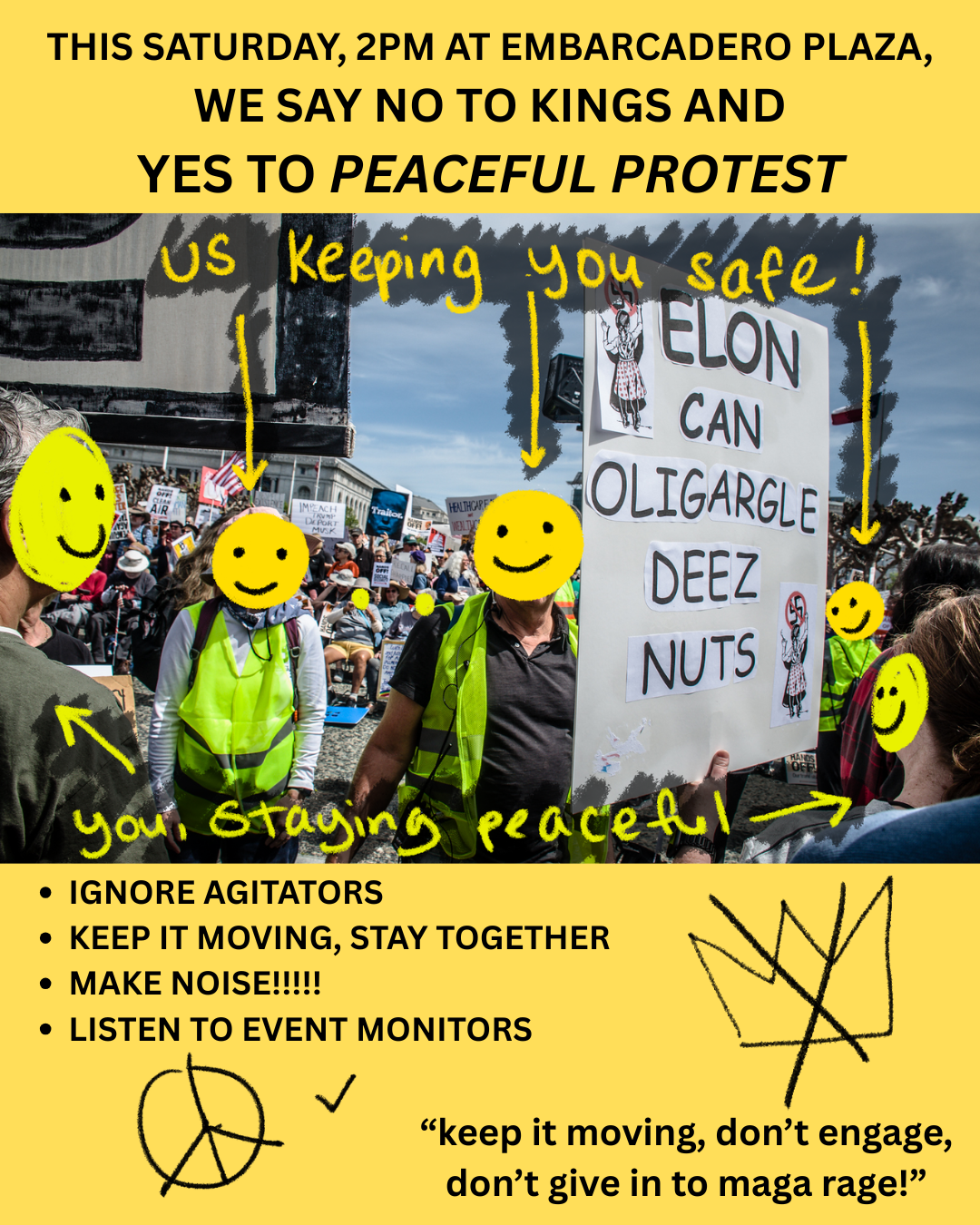 Our event monitors will keep you safe at No Kings SF, and you can too! Remember: Ignore agitators. Keep it moving. Stay together. Make lots of noise! We'll see you at Embarcadero Plaza on Saturday. We're gathering at 1:30 PM and marching at 2 PM sharp.