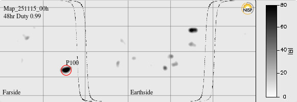 GONG far-side solar imagery (also known as magic!) shows a strengthening active region (marked "P100") coming around the east limb in a few days.