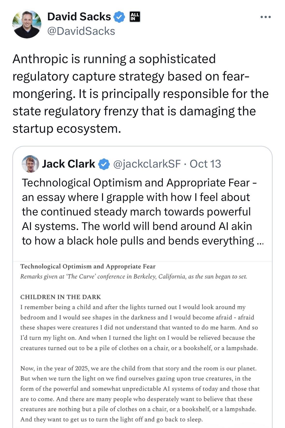 This is interesting. No doubt this executive order favors big tech and is terrible. But, David Sacks, one of Trump's Silicon Valley henchmen, called out Anthropic for what he described as a regulatory capture strategy (screenshot in next toot).